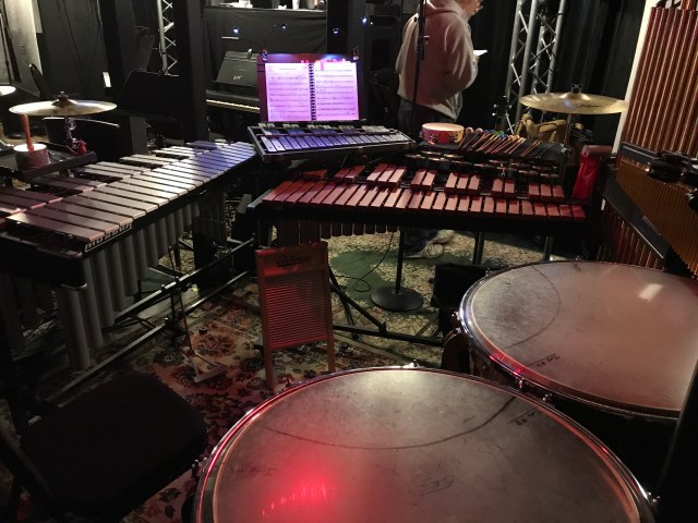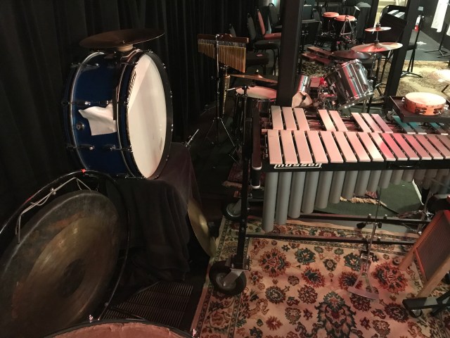The interesting thing about the percussion books for MTI’s Mary Poppins production is that book 1 is almost exclusively pitched percussion. Most of the auxiliary percussion is in book 2 with the drum set. So, while there are fewer instruments in this setup, it’s still about the same size since all the large instruments are here. The part even calls for marimba, although there isn’t one in my setup.